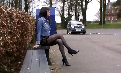 Crossdresser waiting for bus in short dress at night