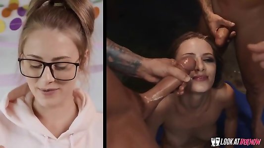 Uber-sexy blondie babe with smallish jugs is doing it with four naughty folks and enjoying it