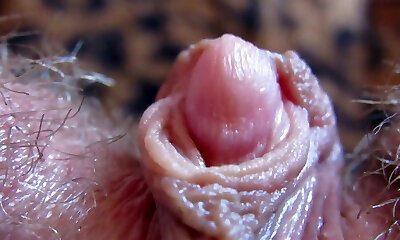 Enormously close up pussy masturbation. Cream is dripping out of shaved pink pussy. Visible orgasm contractions