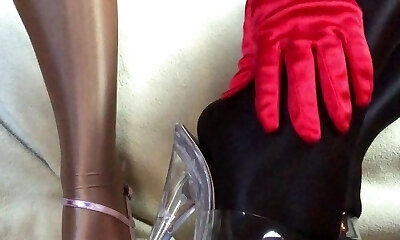 Sensual taunting close up legs and feet in Shiny glossy stockings and high heels.